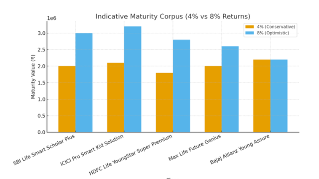 Again: these numbers are for illustration. Always calculate based on your plan’s terms and assumptions of growth (say 4% conservative, 8% optimistic) and inflation. Many insurers publish tables: e.g., Parent age 18, Child age 0, policy term X years – maturity corpus will be Y at 4%/8%.