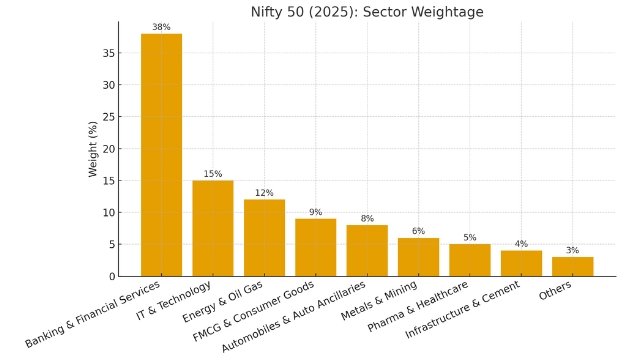 The key sectors represented by Nifty 50 include — Financials / Banks, IT / Technology, Energy, Consumer Goods / FMCG, Automobile, Metals / Mining, Healthcare / Pharma, Industrial / Engineering, and Conglomerates.